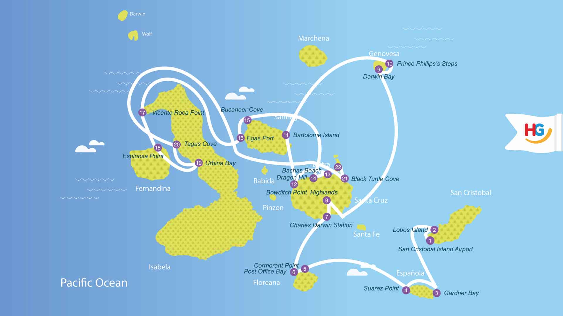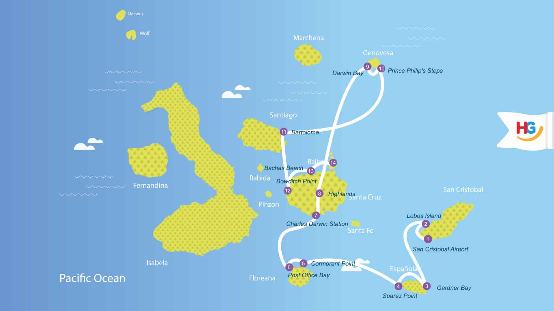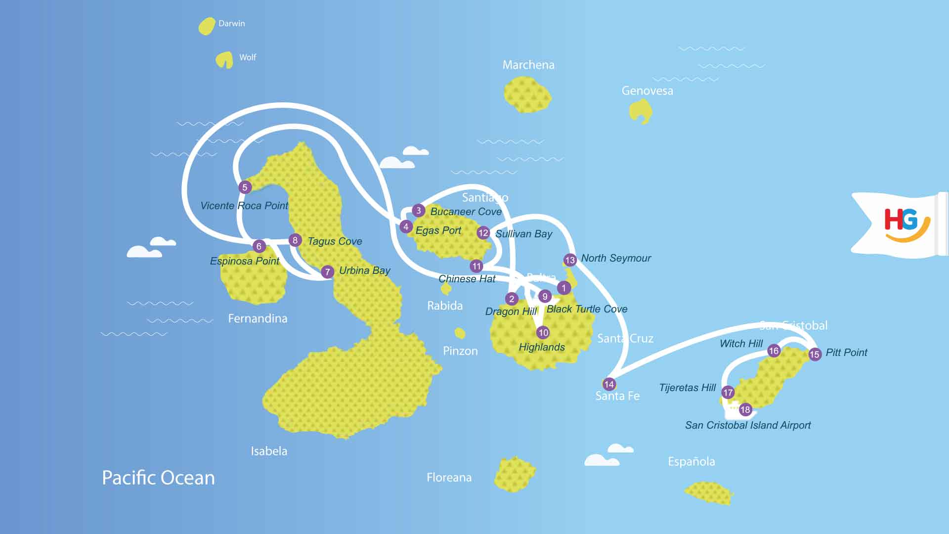 - Op dag 1 is er alleen tijd voor een middagbezoek; Evenzo is er op de laatste dag slechts een kort ochtendbezoek. De reden hiervoor is om verbinding te maken met de aankomst en vertrek van de Galapagos-vluchten op de luchthaven.